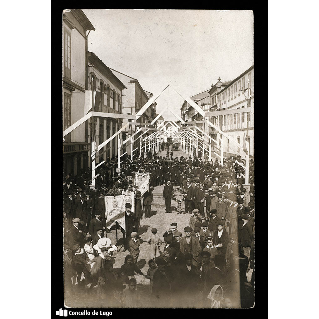Paso do Orfeón Galego pola rúa da Raíña. Lugo Identificación e descrición Referencia: Colección fotográfica Delgado Guisasola / 1006. Título: Paso do Orfeón Galego pola rúa da Raíña. Lugo. Autor: Ameijide. Data de creación: 1910 / Década: 1901-1910. Nivel de descrición: Unidade documental. Volumen e soporte: 1 fotografía, 14×9 cm, positivo, branco e negro. Historia […]