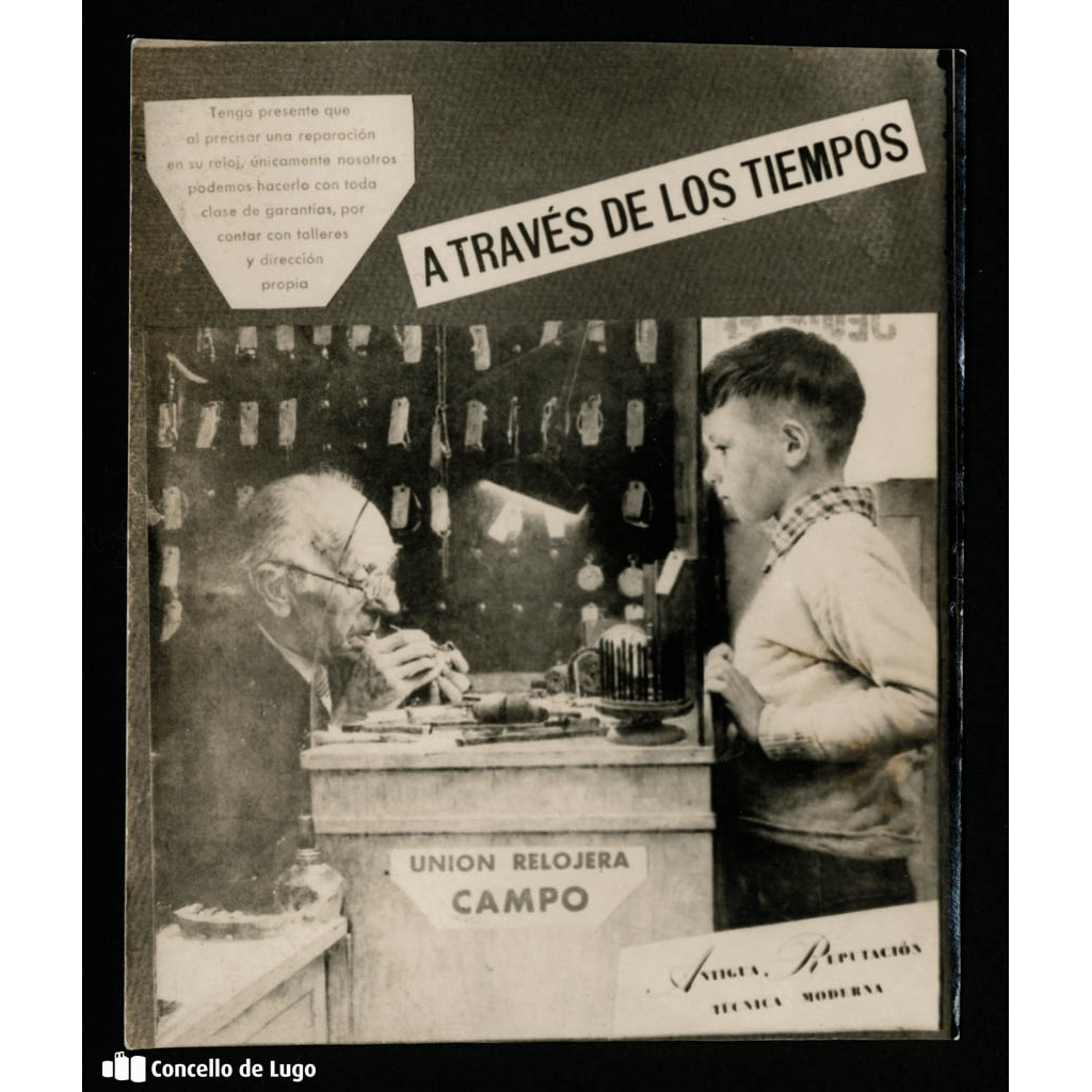 Montaxe fotográfico para publicidade de reloxaría Identificación e descrición Referencia: Colección fotográfica Delgado Guisasola / 1943. Título: Montaxe fotográfico para publicidade de reloxaría. Autor: Descoñecido. Data de creación: / Década: 1941-1950. Nivel de descrición: Unidade documental. Volumen e soporte: 1 fotografía, 12×9 cm, positivo, branco e negro. Historia e alcance Alcance e contido: Montaxe publicitario […]